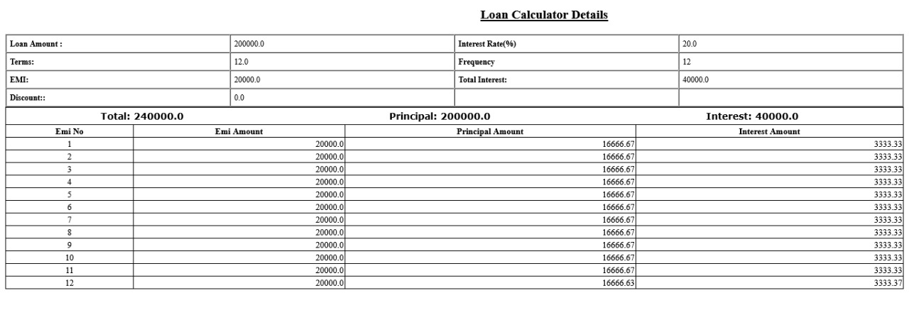>The principal amount is Rs 2,00,000 and the loan terms include an interest rate of 20% for 12 Months. Using the flat-rate method to calculate the EMI,